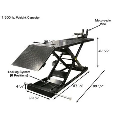 The Atlas® HI-RISE 1500 is the ultimate heavy-duty lifting solution for those who demand maximum height and versatility. With a massive 1,500 lb. capacity, this lift is engineered to handle much more than just motorcycles; it is perfect for ATVs, UTVs, golf carts, and commercial lawnmowers. Reaching an impressive 42.5 inches, it allows you to work comfortably in an upright position, making it a favorite for professional technicians and serious DIYers alike.
