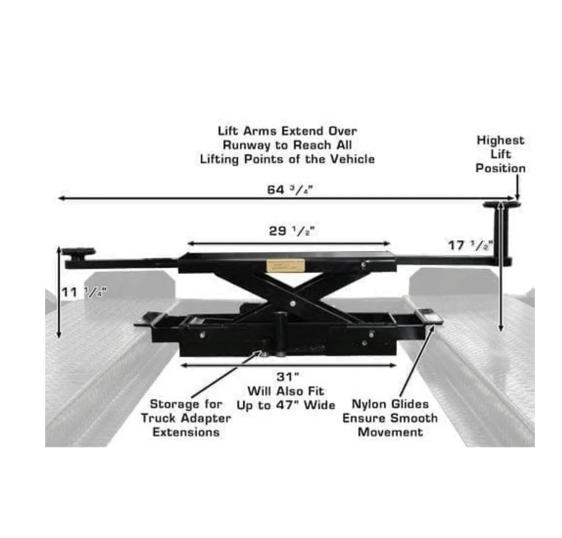 * Low-Profile Design: Compact build allows for easy positioning and storage between the lift runways.